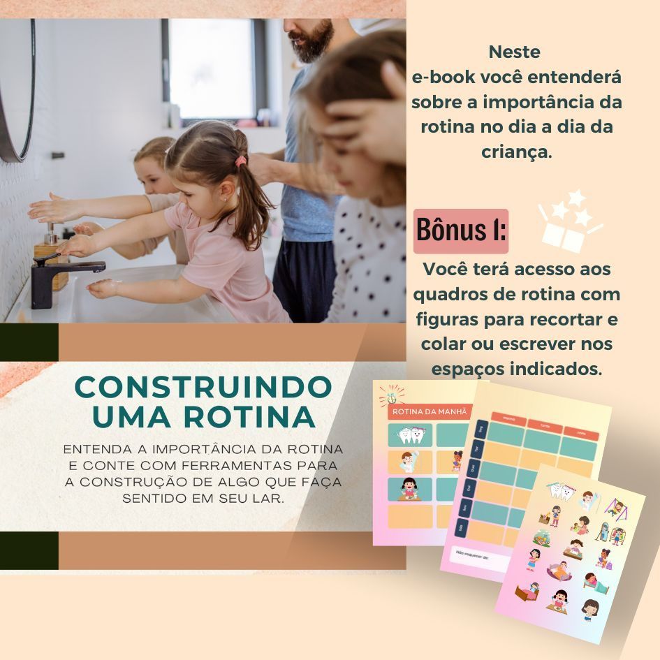 Com este você entenderá a importância da rotina no dia a dia de uma criança e já terá o arquivo para imprimir e já colocar em prática o que aprende!